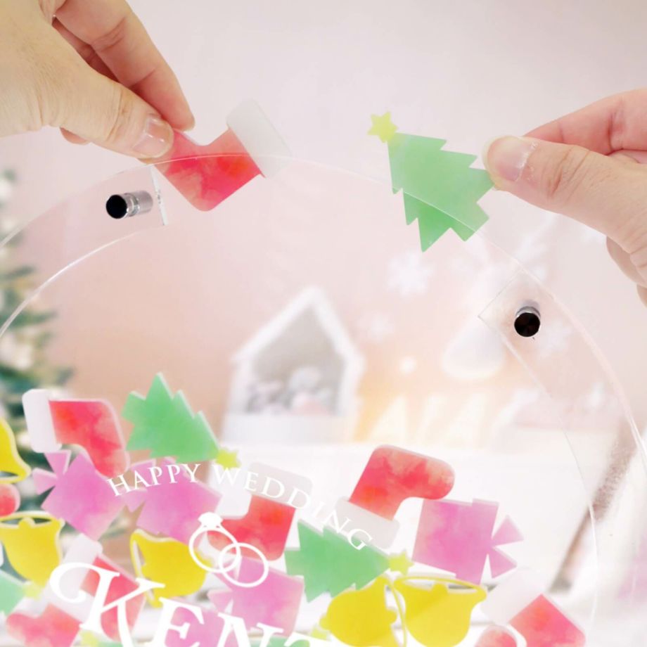 80枚のアクリルピースは4種類の形をご用意。くつした、ツリー、ベル、プレゼントのクリスマスモチーフにデザインしました。