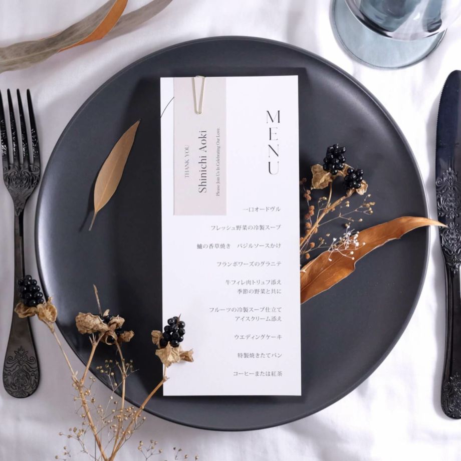 席札&メニュー表はシンプルなデザインながらも、トレンド感のあるクリップ使いが映えます。